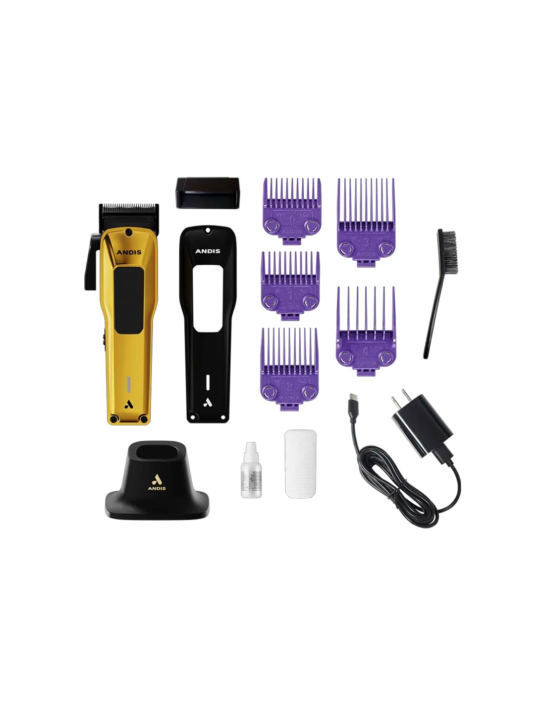 Clipper comes equipped with gold cover and black textured grip, secondary black cover and white textured grip, 5 dual-magnetic attachment combs (#0 - 1/16", 1# - 1/8", #2 - 1/4", #3 - 3/8", #4 - 1/2"), blade cleaning brush, premium charging stand , USB-C charging adapter, blade oil and blade guard.