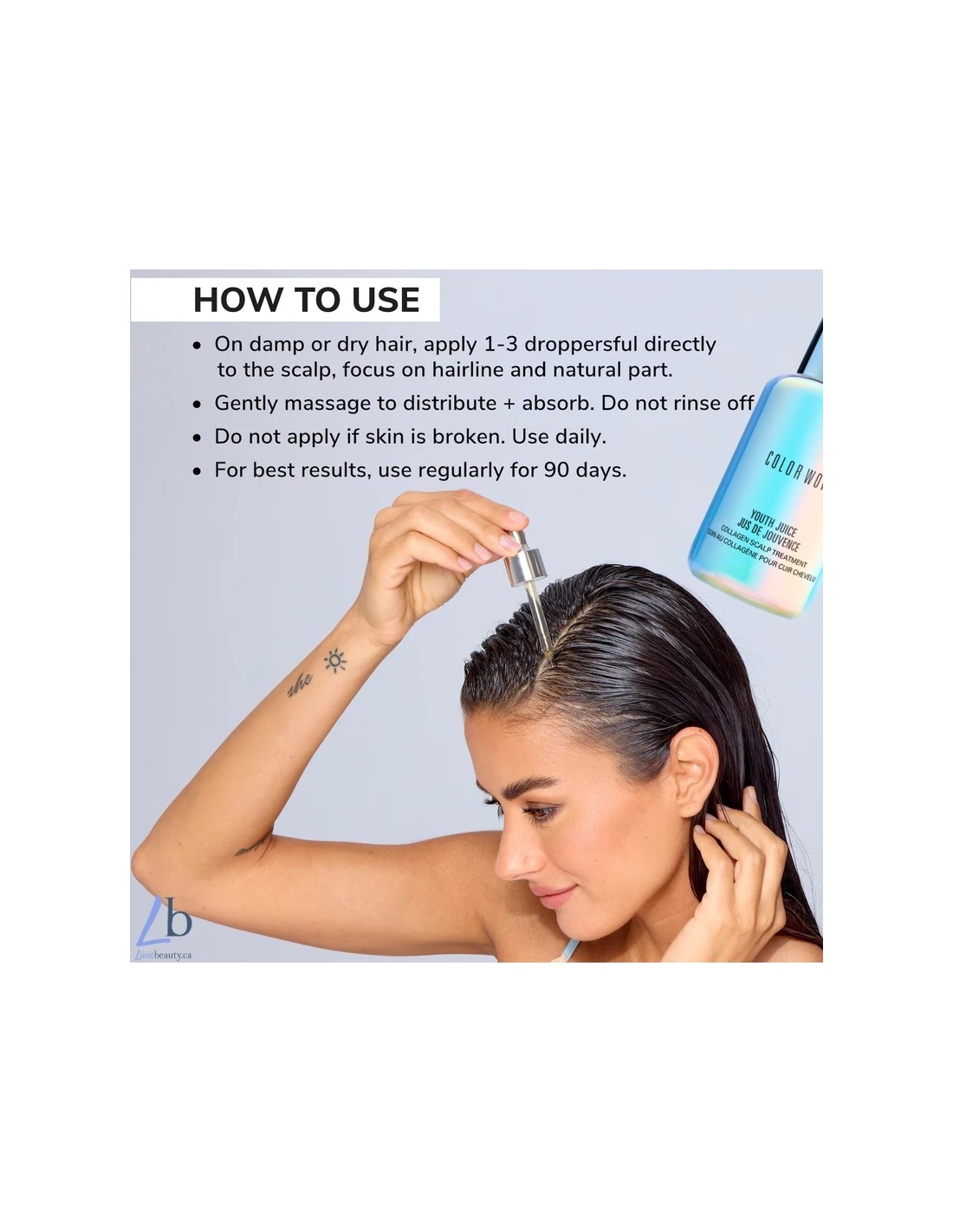 - On clean damp or dry hair apply 1-3 droppersful directly to the scalp along the hairline and natural part.