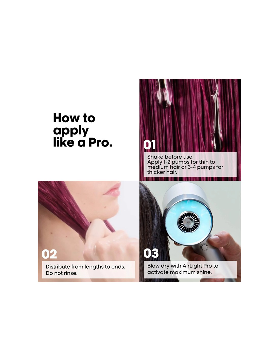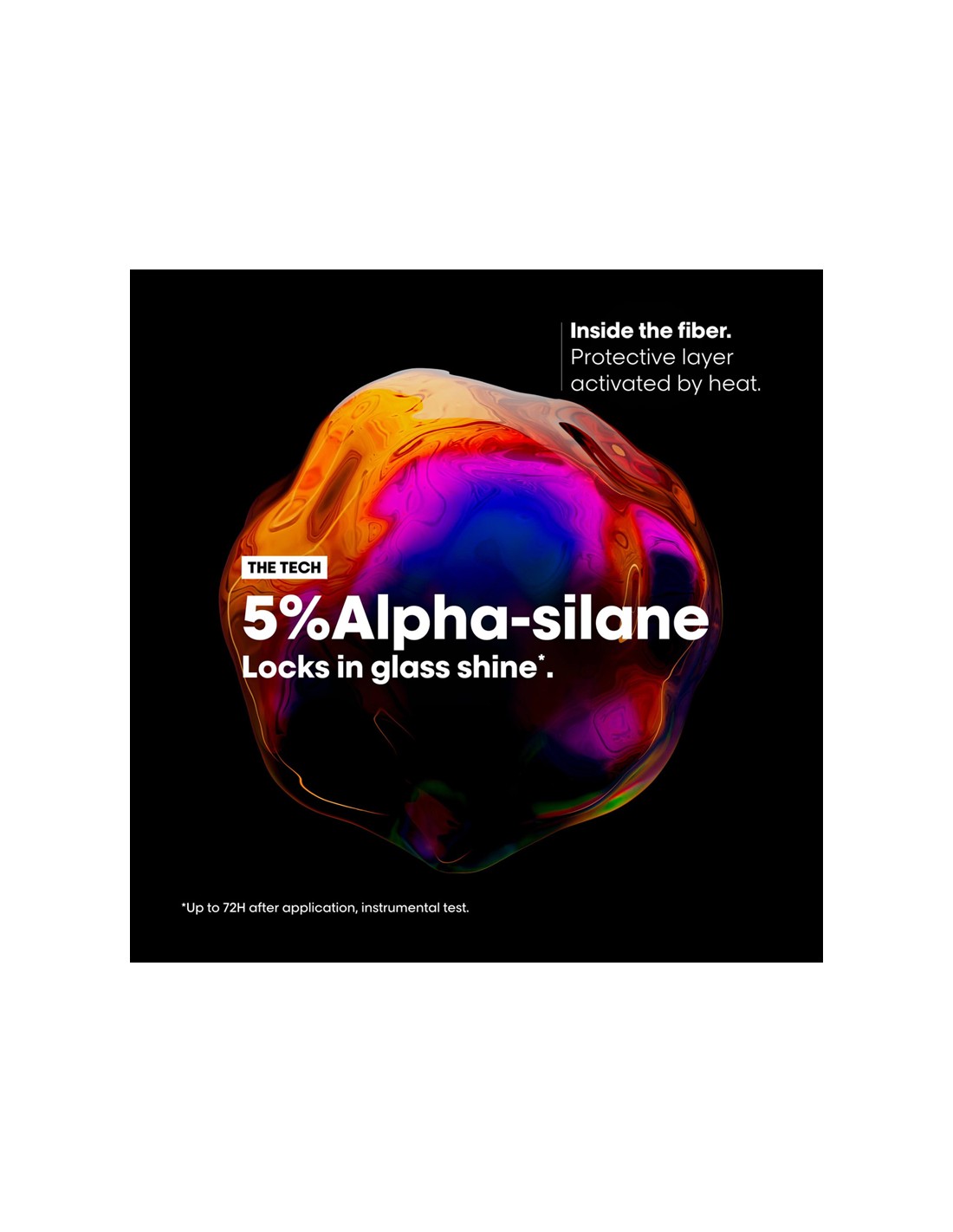 Infused with advanced Ferulic Acid and Citric Acid technology, it smooths the hair cuticle and delivers long-lasting protection against heat (up to 230°C / 450°F). Hair is left soft, luminous, and brilliantly glossy — like glass.
