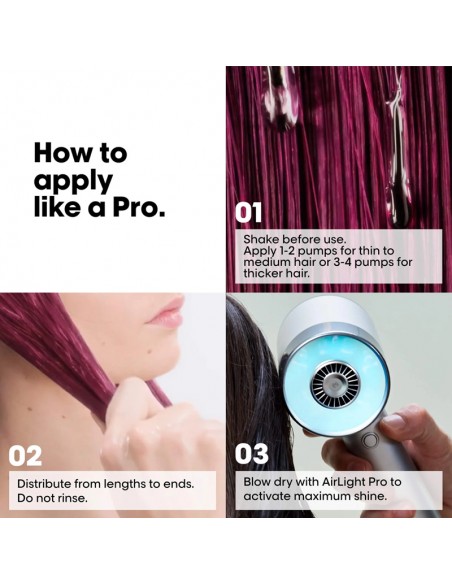 - Shake before use. Apply 1–2 pumps to towel-dried hair (3–4 for thicker hair).