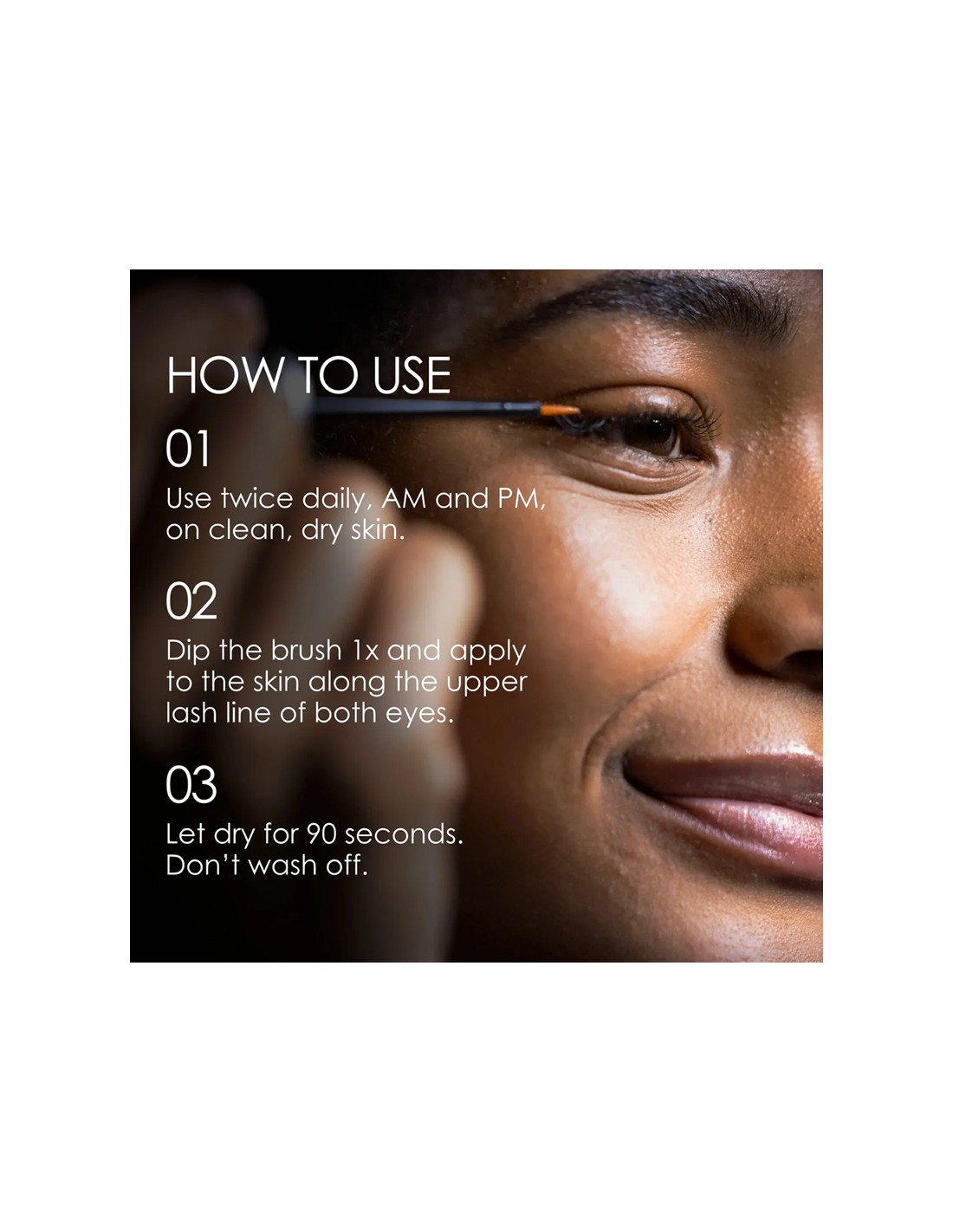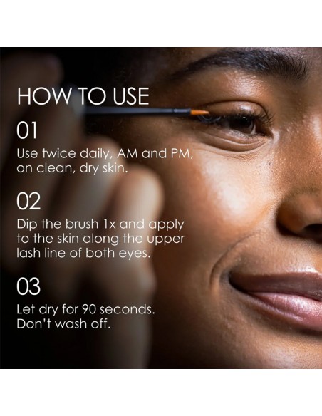 - Allow to dry for at least 90 seconds before applying other eye products. There's no need to apply to the lower lash line.