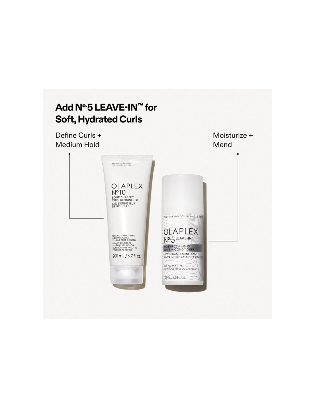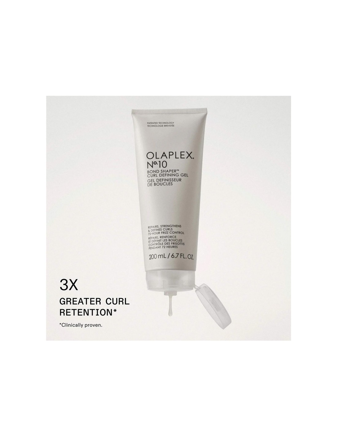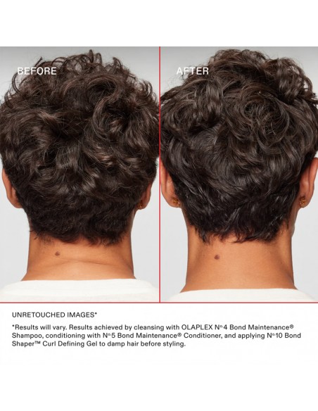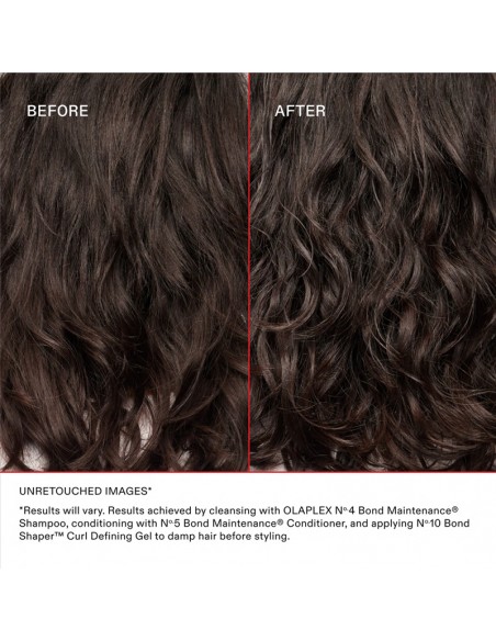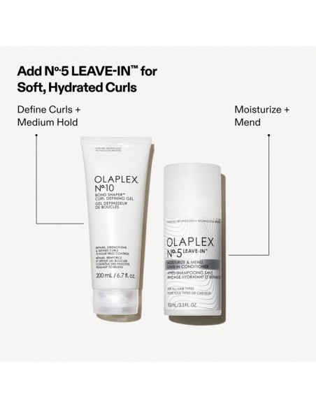 Nº.10 Bond Shaper™ Curl Defining Gel revitalizes natural curl patterns in wavy and curly hair. This humidity-resistant, anti-frizz gel provides flexible hold, ensuring soft, smooth, and hydrated curls without any crunchiness. Infused with OLAPLEX Bond Building Technology™, it strengthens the bonds that form curls, promoting healthier, more defined waves and curls.