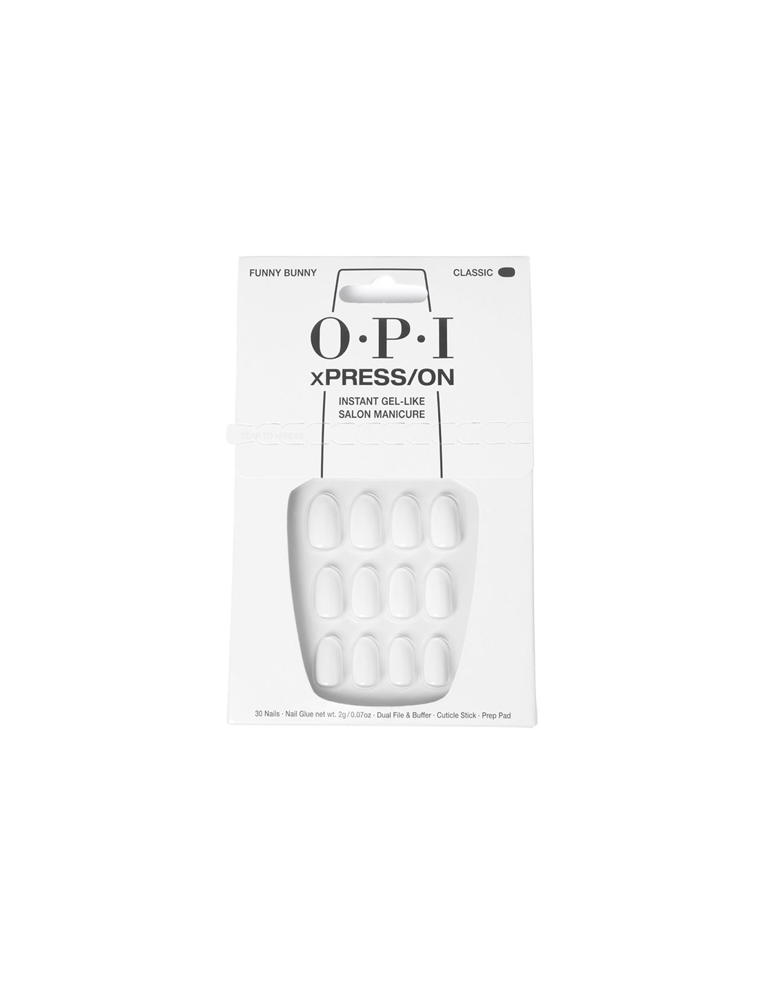 OPI xPRESS/ON Press-On Nails in Funny Bunny deliver a delicate, milky-white manicure with a clean, glossy finish. Designed in a classic round shape, these reusable press-on nails provide a natural, polished look in minutes — no dry time required.