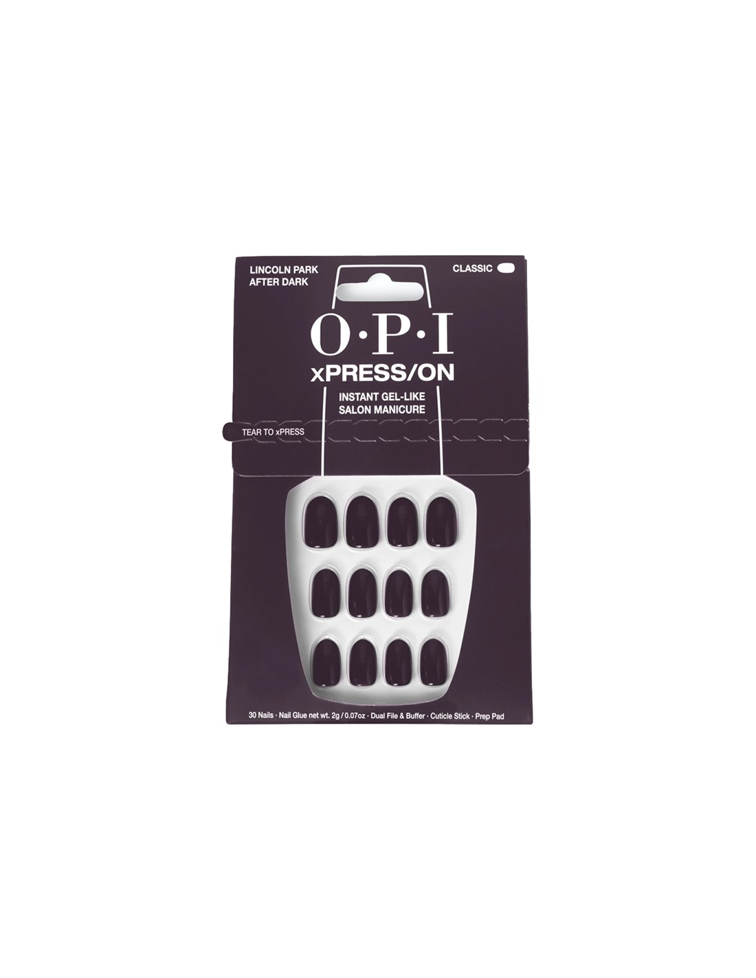 OPI xPRESS/ON Press-On Nails in Lincoln Park After Dark deliver a luxurious, near-black plum manicure with a high-gloss, professional finish. Designed in a classic round shape, these reusable press-on nails offer a comfortable fit and long-lasting wear — no dry time required.