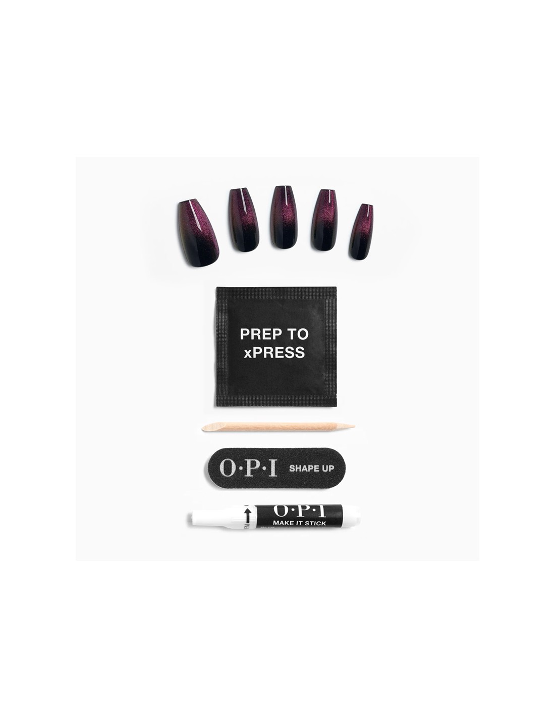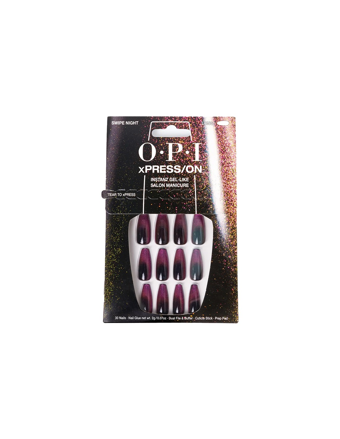 Each OPI xPRESS/ON nail kit delivers professional-quality shades, nail art designs, and innovative nail effects right at your fingertips. Mix and match colors and styles to create a custom manicure. Every set includes nail glue, a cuticle stick, a dual nail file and buffer, an OPI prep pad, and 30 nails in multiple sizes for a precise, comfortable fit.