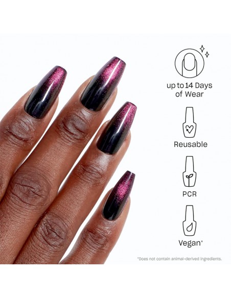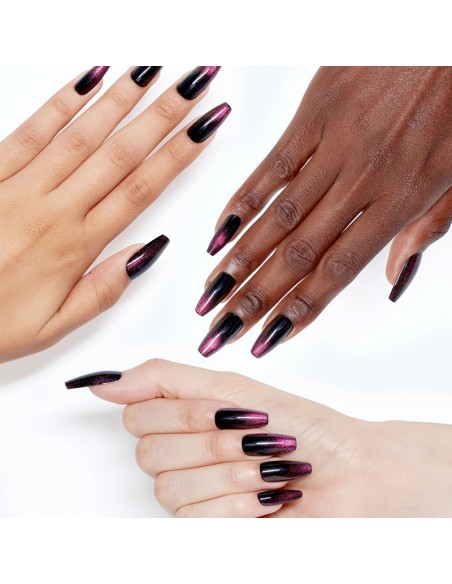Switch effortlessly into night mode with these long black press-on nails featuring a striking magenta cat-eye effect. Designed in a sleek coffin shape, they showcase the magnetic shimmer for a bold, mysterious finish.