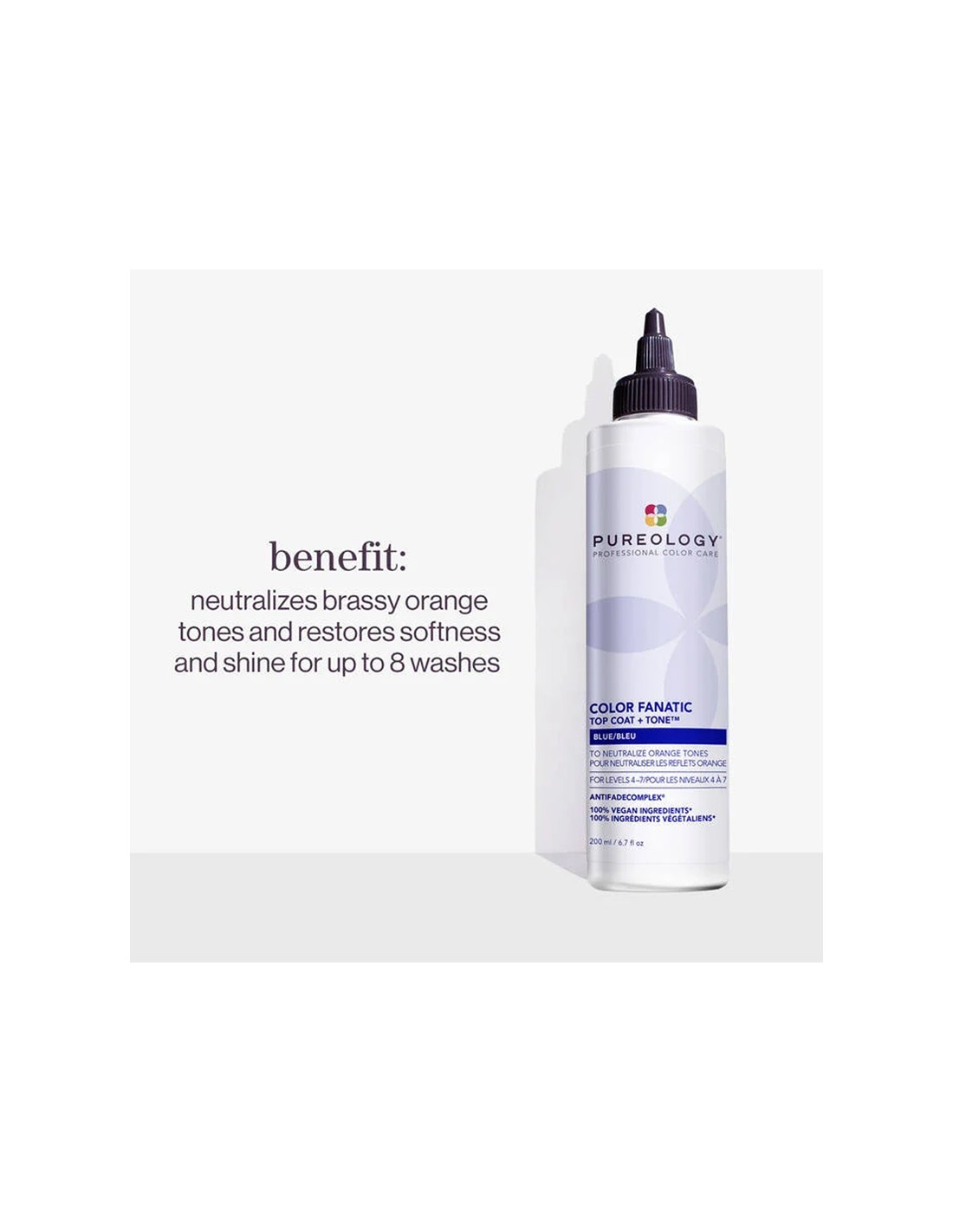 Neutralize brass and restore shine with Pureology Color Fanatic Top Coat + Tone Blue. Formulated for dark blonde to dark brunette hair, this rich blue glaze eliminates orange undertones in just 5 minutes, delivering a cool, polished tone without compromising softness. With Pureology’s AntiFade Complex®, plus nourishing oat milk and camellia oil, it conditions and seals the cuticle for a luminous, salon-fresh finish that lasts up to 8 washes. Vegan and sulfate-free, this treatment is ideal between color services when your tone needs a refresh.