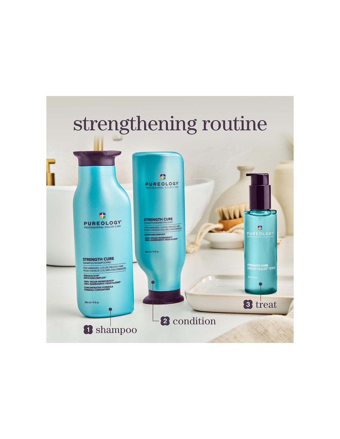 - Strength Cure Conditioner 266ml – Detangling, strengthening conditioner that smooths and restores softness.
