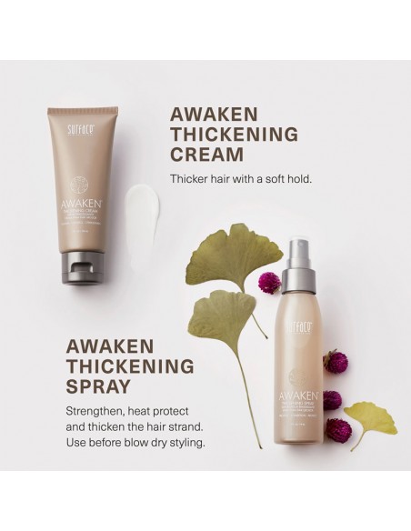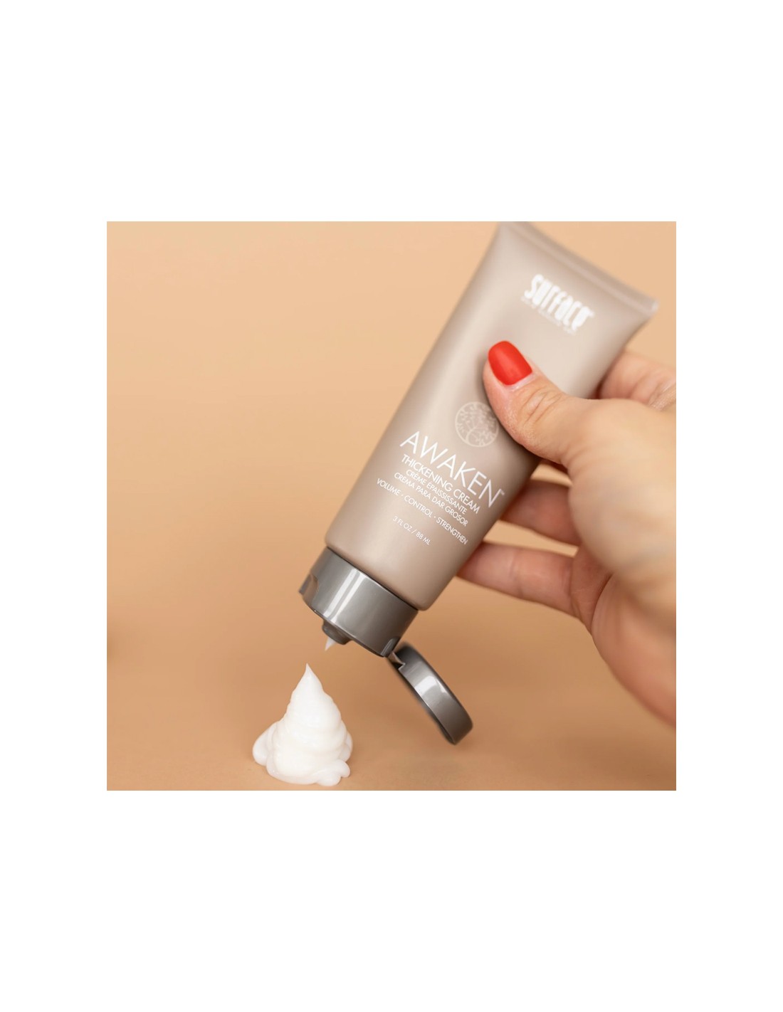 Surface Awaken Thickening Cream is a refined, salon-grade styling treatment designed to instantly enhance thickness, structure, and control for fine or fragile hair. This lightweight cream delivers visible body and density while strengthening strands from within, leaving hair fuller, smoother, and more resilient. The advanced botanical and protein-rich formula provides polished definition and flexible control without heaviness, residue, or stiffness.